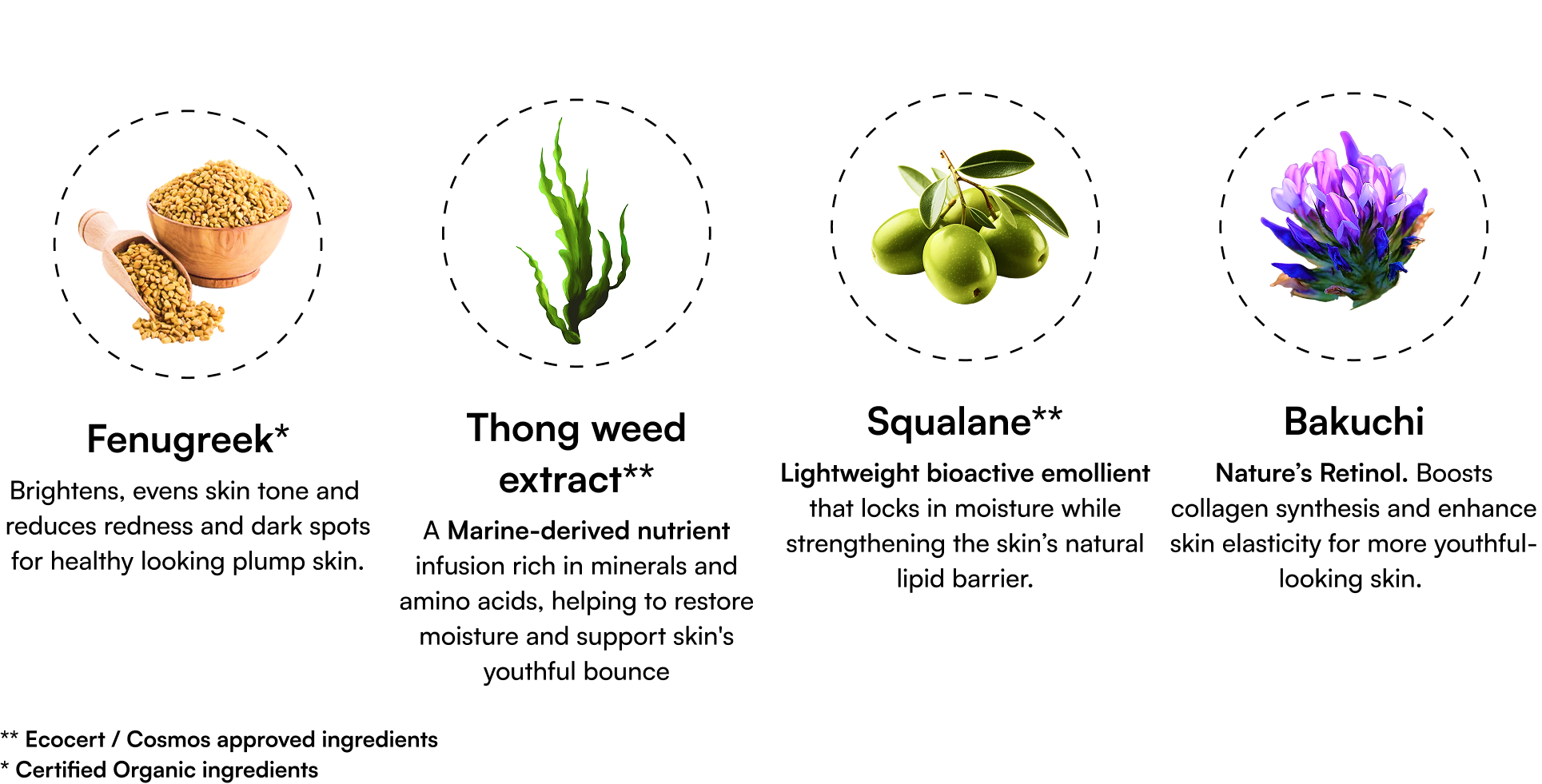 1. Organic Fenugreek Extract: Visibly brightens, evens skin tone and reduces redness and dark spots for healthy looking plump skin.